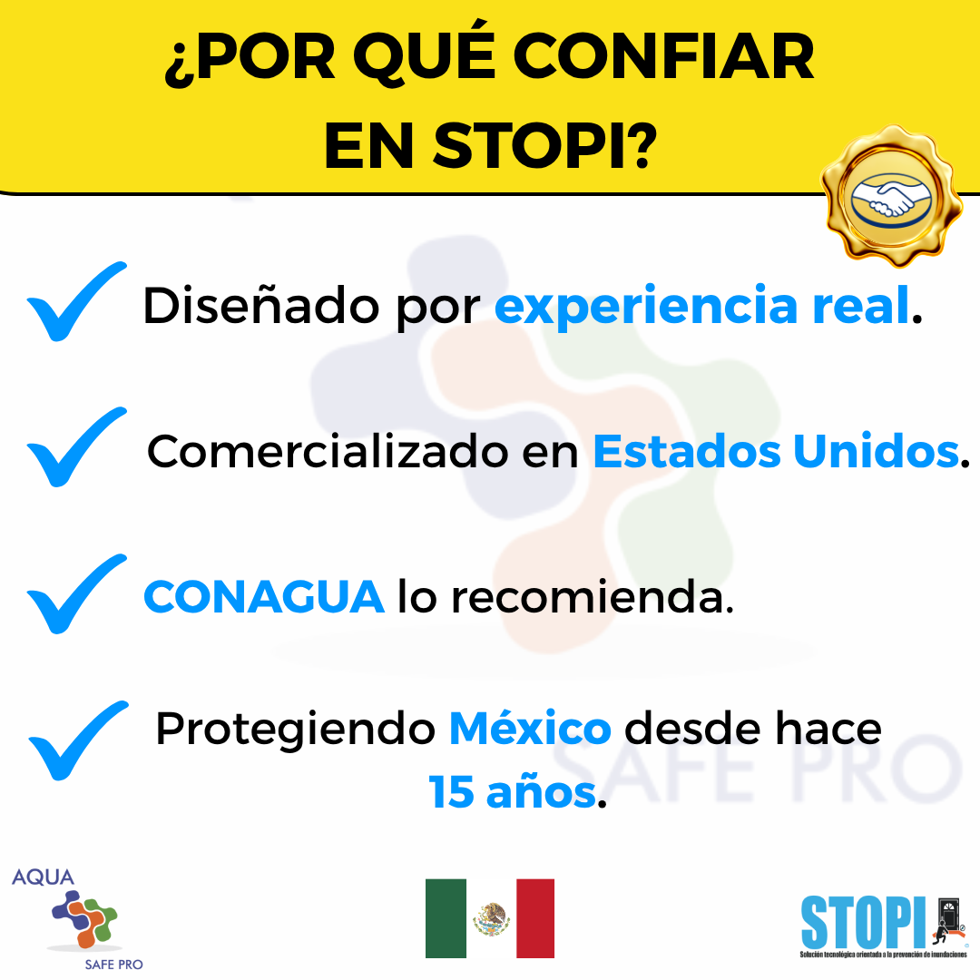 NOTA: Este producto es un sistema preventivo para minimizar y reducir la cantidad de agua de lluvia que se mete por debajo de puertas, ventanas corredizas y marcos de puerta en condiciones de inundación lenta y progresiva como lo define la CONAGUA en su desahogo folio B00-1890 STOPI sacos 2018.